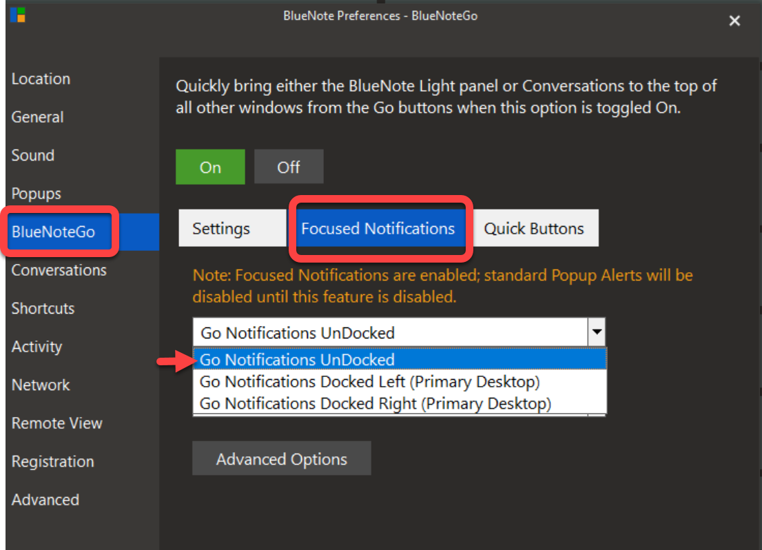 To turn on BlueNoteGo, open the BlueNote Lights program and choose Menu > Preferences > BlueNote Go and toggle the red button under the BlueNoteGo tab to On. The bar will appear in the middle of the window. Toggle it back Off to remove the Go button from the user's screen, When BlueNoteGo is On, this is where you'll also choose whether or not the Conversations and Do Not Disturb buttons are enabled. If the Go Button seems too large in relation to the other windows on the monitor, the user has the option to make the Go UI button smaller.